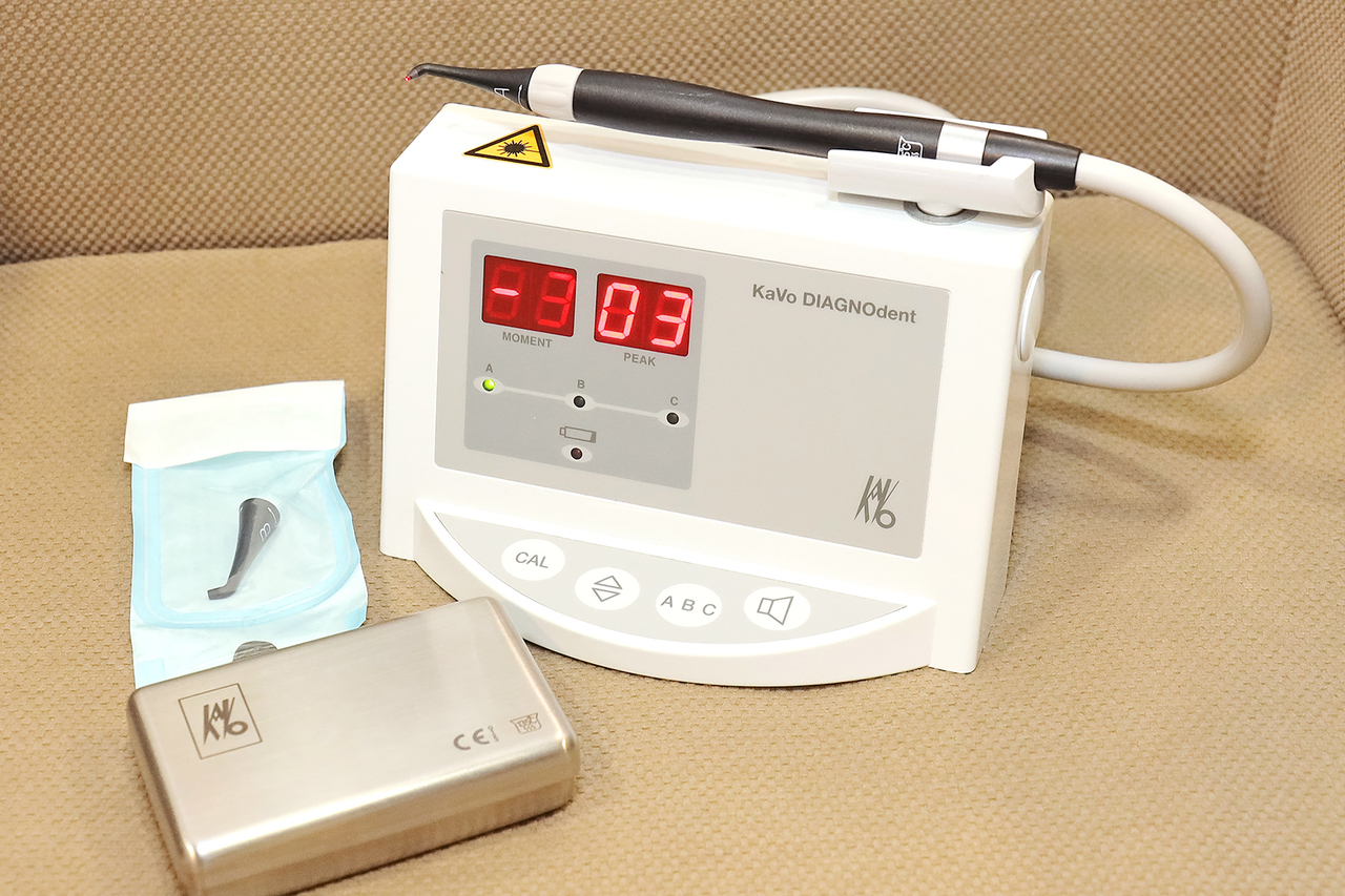 歯の溝や表裏面に、滅菌されたセンサーを接触させ数値で虫歯の進行状態を検査できる器械です。当院では近赤外線を利用した初期う蝕を検知するNIRIとともに、早期発見、非切削による虫歯治療、予防に活躍しています。従来からの視診や探針による方法に比べ、正確な診断が得られ非侵襲性の痛くない簡単な検査です。一般的にレントゲンで虫歯が発見される場合は、ある程度進行してから分かるため、ほぼ100%歯を削って治療になるため、このような検査装置は良質な治療や予防を患者さんに提供する上で必要になります